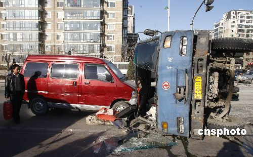 十二月十五日,北京天通苑小區門前道路,一輛拉載水泥板的大型貨車在路口拐彎時側翻,造成交通堵塞。中新社發 廖文靜 攝