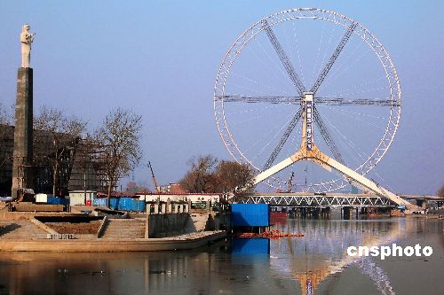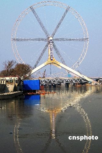 12月18日,位于天津三岔河口的重要景觀工程——“天津之眼”摩天輪輪盤安裝完畢,轉入負重測試和摩天輪座艙、電力驅動裝置安裝階段。“天津之眼” 摩天輪直徑110米,其最高點距離地面約120米。輪盤外掛48個透明座艙,可供384人同時觀光,是名副其實的“天津之眼”。 中新社發 田齊 攝