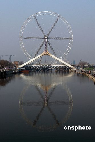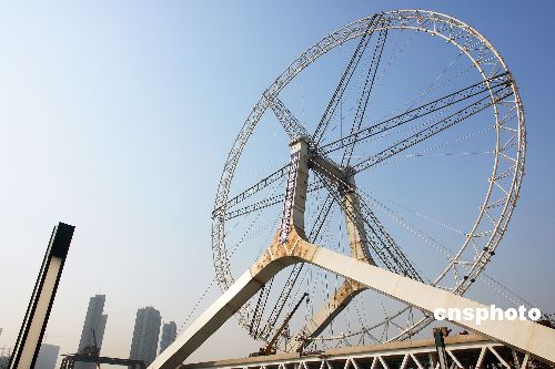 12月18日,天津海河永樂橋(原名慈海橋)上的“摩天輪”正式合龍。俗稱“天津之眼”的“摩天輪”直徑為110米,共有48個透明座艙,每個座艙最多可坐8人,可同時供380余人觀光,勻速轉動一圈大約需要30分鐘。中新社發 李勝利 攝