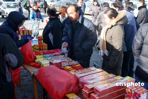 12月30日,北京市開始大規(guī)模向五環(huán)外沃爾瑪?shù)却笮统辛闶劬W(wǎng)點配送花炮,五環(huán)外的一些臨時網(wǎng)點也掛上新頒發(fā)的許可證準(zhǔn)備開業(yè)。元旦節(jié)前,市民可到五環(huán)外的這些零售網(wǎng)點購買花炮。中新社發(fā) 富田 攝