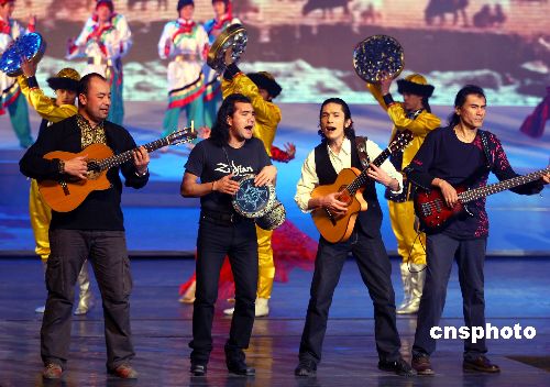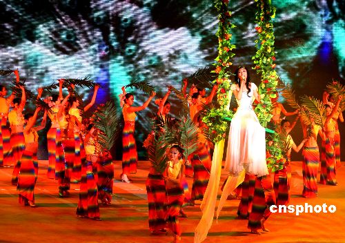 2007年12月31日晚,中國中央電視臺在北京舉辦2008年元旦雙語(漢語、英語)晚會,中國及日本、韓國、泰國、馬來西亞、新加坡、印度等國家的藝術家同臺獻藝,歡度新年佳節,他們以歌曲、舞蹈、雜技、魔術、服裝秀、戲曲等藝術形式,祝福各國人民愉快。中新社發 宋吉河 攝
