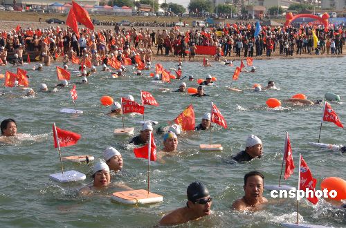 1月1日是全國冬泳日,福州市冬泳協(xié)會(huì)組織的千余名冬泳健兒,從福州閩江公園西河園入水,往返橫渡閩江,以此迎接新年的到來。中新社發(fā) 鄭祚聲 攝