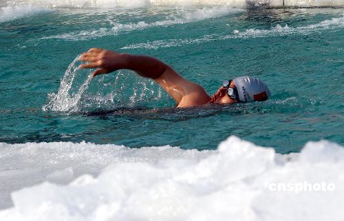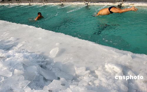 一月二日,新疆烏魯木齊市最低氣溫接近零下二十度,在該市紅山室外游泳館,幾位冬泳愛(ài)好者不畏嚴(yán)寒,縱身跳入冰冷的泳池。據(jù)該游泳館工作人員介紹,進(jìn)入冬季氣溫不斷下降,前來(lái)冬泳的市民絡(luò)繹不絕,很多冬泳愛(ài)好者利用中午休息時(shí)間游一兩圈,以達(dá)到強(qiáng)身健體,增強(qiáng)免疫力的功效。中新社發(fā) 劉新 攝