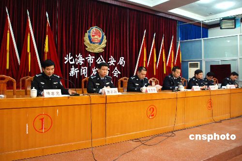 2007年12月30日,廣西北海市一家娛樂城經(jīng)理及其手下十余名打手,以暴力公然阻礙警務(wù)人員抓捕嫌犯,并將兩名執(zhí)勤警員毆打致傷。北海警方1月3日宣布,制造這宗中國罕見的暴力襲警事件的16名兇徒,目前已全部被抓捕歸案,并被以涉嫌妨害公務(wù)罪刑事拘留。圖為警方召開的新聞發(fā)布會(huì)現(xiàn)場。 中新社發(fā) 龐博斌 攝