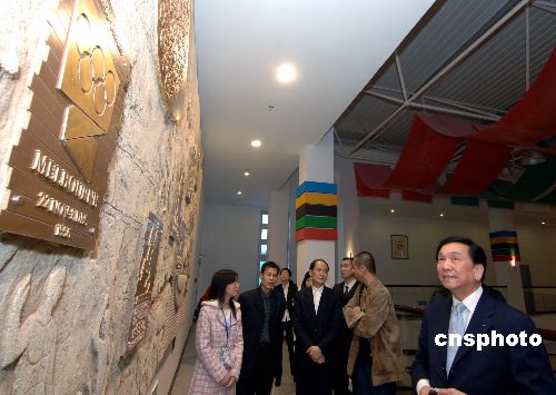 中國臺北國際奧委會委員吳經國先生(右一),在廈門奧林匹克博物館向來賓介紹歷屆夏季奧運會海報浮雕墻。