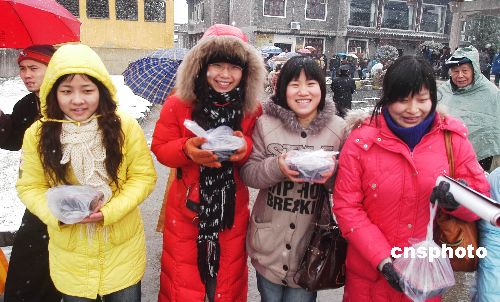 1月15日上午9時,江蘇揚州大明寺臘八節放粥送福發放處,近千市民冒雪排長隊領取免費臘八粥和“福”字。當日清晨5時,該寺廟開始放粥送福活動。中新社發 范友林 攝