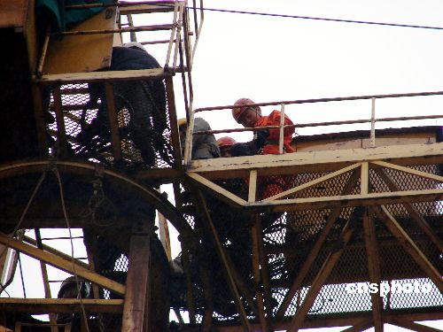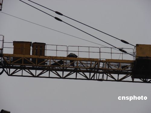 一月十八日,廣西南寧市青秀區一工地內,一名民工因索要誤工費、醫藥費未果,爬上六十米高的塔吊揚言自殺。滿足其條件后,該民工因在塔吊上喝了一瓶白酒不能自己下來。中新社發 胡明軍 攝