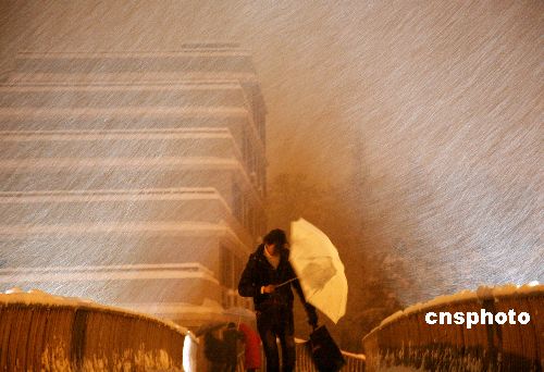 1月27日晚,行人在紛飛的大雪中和被積雪覆蓋的道路上艱難的行走。當(dāng)晚,江蘇省南京市再次出現(xiàn)中到大雪的降雪過程,部分地區(qū)降雪量達(dá)10毫米以上,局部地區(qū)出現(xiàn)暴雪,江蘇省氣象臺(tái)在當(dāng)晚18時(shí)20分首次將暴雪黃色預(yù)警變更為暴雪橙色預(yù)警,提醒相關(guān)部門和市民做好防雪災(zāi)、防凍害和道路清掃、積雪融化工作。中新社發(fā) 鐘山 攝
