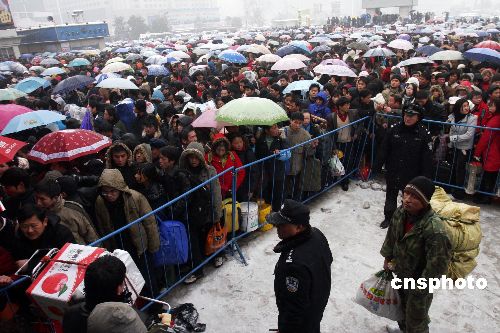 1月28日,漢口火車站廣場上客流爆滿,檢票進(jìn)站口乘客們在雪中艱難前移。武漢市連日來的強(qiáng)降雪給交通帶來極大不便,火車站因列車晚點(diǎn)、停發(fā),滯留了大量的旅客。中新社發(fā) 攝記 攝