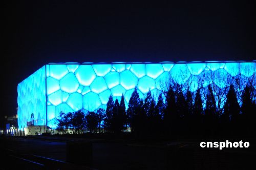 1月29日晚,北京國家體育場(鳥巢)景觀燈亮了,與國家游泳中心(水立方)遙相輝映。中新社發 馮軍(北京) 攝