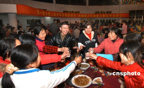 1月31日晚,浙江義烏一公司領導與留守在企業的400余名員工一起吃年夜飯。近段時間,由于遭受極端雨雪冰凍天氣,義烏100多萬外來民工中有20多萬人不能返鄉過年。中新社發 張建成 攝