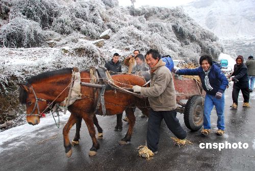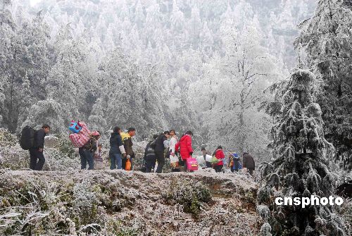 2008年1月31日,在貴陽市海拔二千多米的高坡鄉(xiāng),公路上凝凍有1.5公分厚。許許多多在外打工的農民工肩上擔著過年貨,腳下綁扎著稻草,使用各種方法趕路回家。中新社發(fā) 張?zhí)炝?攝