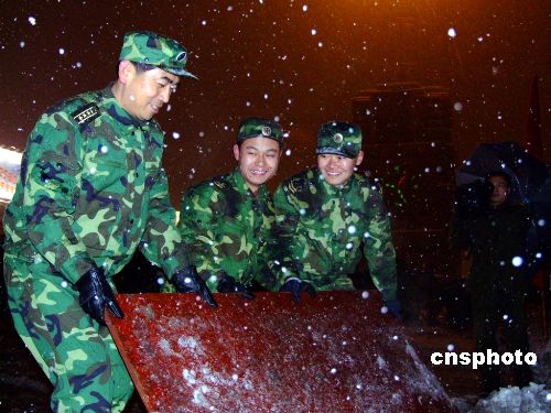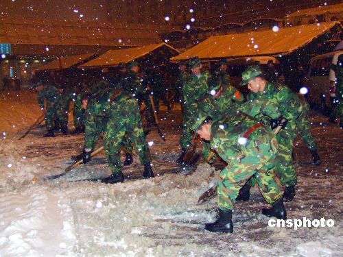圖:南京軍區官兵深夜在杭州火車站掃雪
