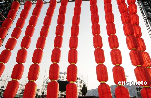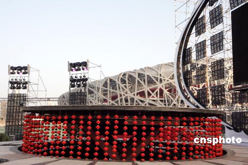 圖:“鳥巢”奧運工地掛紅燈籠迎新年