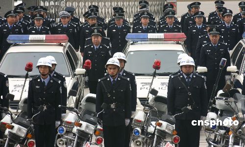2月3日,公安警察莊嚴宣誓。當日,重慶永川區公安局舉行“2008東亞女足錦標賽安保工作誓師大會”,全局500名干警參加了誓師大會,確保治安環境,確保女足錦標賽順利舉行。中新社發 陳仕川 攝