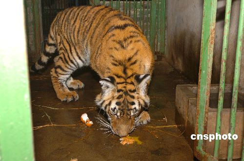 2月4日,在南昌動物園,華南虎“明明”正津津有味吃著飼養員送來的新鮮豬肉。“明明”(原名華華)出生于上海,其父是南昌動物園寄養在上海的雄性虎。它約半歲時運回南昌,與成年虎相比,這只小華南虎特別活潑好動,惹人喜愛。由于患有雙目先天性白內障,小虎走路時經常碰壁,并且總是憑嗅覺發現食物。1月27日,南昌大學二附院眼科專家為小華南虎成功實施國內首例華南虎白內障摘除術。經過一個星期的術后恢復,情況良好的小華南虎被送往籠舍重新恢復與游客見面。為紀念小華南虎獲得健康視覺,南昌動物園將華南虎“華華”更名為“明明”。中新社發 朱文標 攝