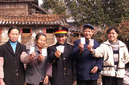 2月8日,凱里車務段職工上門為凱里市紅巖村村民吳章海等送來預定返程火車票。近日,貴州連續出現了50年罕見的冰凍,為確保農民工按時拿到火車票,成都鐵路局凱里車務段開展了多項便民措施,確保返程農民工不但走得了而且走得好,真正做到“平安和諧”春運。中新社發 姜澤鵬 攝