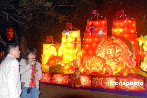 2008年2月7日晚,游人在“現代都市”燈前休閑觀賞。農歷大年初一,眾多市民和游客到海口萬綠園觀賞“華燈璀璨耀椰城”大型燈展。中新社發 善平 攝