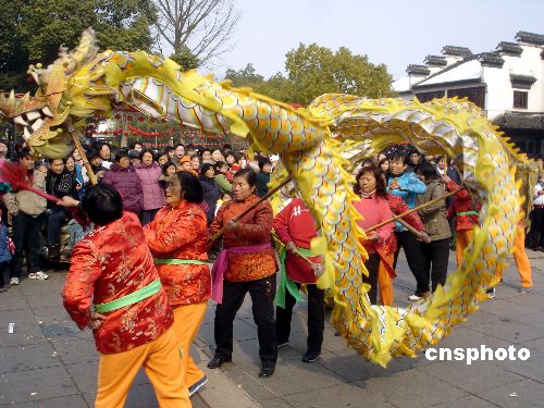 2月8日農歷大年初二,一支由蘇州古鎮同里農村婦女組成的舞龍表演隊在同里鎮退思廣場上表演,給節日的古鎮增添了濃濃的喜慶氣氛,吸引了眾多古鎮居民和中外游客觀看。中新社發 王建康 攝