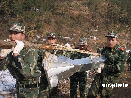 2月8日,湖南省婁底市武警支隊100多名武警官兵冒著風雪和山高路滑,每天將近20噸電力鐵塔的部件分散運送到湘鄉市壺天鎮山上進行線路搶修。中新社發 郭國權 攝