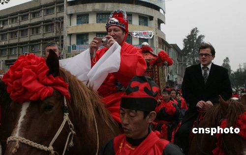 春節期間,福建省平潭縣城的一支老外娶親隊讓大街小巷沸騰了起來,娶親的法國人史蒂文按正宗的中國傳統婚俗迎娶平潭新娘。這對新人是一九九九年在廣州廣交會上認識,經歷了近十年愛情長跑才走到了這一天。中新社發 小小 攝