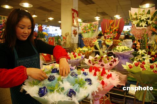 2月11日,上海各路花商紛紛展開“情人節鮮花”市場的布局,圖為花商為最暢銷的進口“藍色妖姬”包裝。據了解,“藍色妖姬”近年來一直受上海人寵愛,由十一支進口“藍色妖姬”組成的花束,代表著“一心一意”口彩,是“情人節”中花中新貴,通常價格在千元以上。中新社發 潘索菲 攝