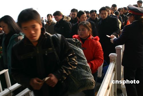 2008年2月11日,春節(jié)長(zhǎng)假接近尾聲,人們紛紛踏上返程路,有的回家,有的奔赴工作崗位。南京火車站因此迎來春節(jié)后的客流高峰。中新社發(fā) 阿董 攝