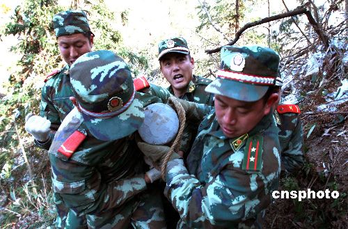 2月13日(農歷年初七),麗水市武警支隊官兵在搬運水泥電線桿。浙江麗水市云和縣安溪畬族鄉東岱村在海拔700米以上,在今年遭遇的雪災中,電力線路中斷了20余天。當天麗水市武警支隊60多名官兵經過3天奮戰,在冰雪地搬運了36根水泥電線桿,幫助電力職工搶修線路。中新社發 歷記攝 攝