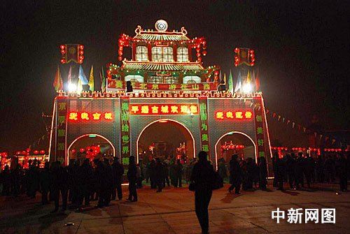 節(jié)日里的平遙古城流光溢彩,燈彩迷人,各色燈組為當(dāng)?shù)鼐用窈椭型庥慰蛶?lái)了強(qiáng)烈的視覺(jué)沖擊和心靈震撼。裴旭亮 攝