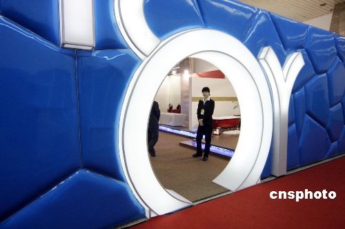 3月2日,2008中國國際建筑裝飾及材料博覽會在北京中國國際展覽中心舉行。一家衛浴參展商為了吸引客商和觀眾,仿造國家游泳中心“水立方”造型布置展位。中新社發 吳芒子 攝