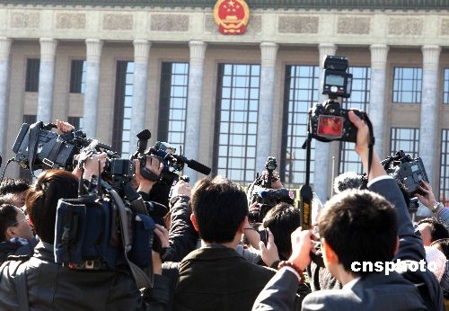 3月3日下午,全國政協十一屆一次會議在北京人民大會堂開幕,一場3000媒體人報名參加的新聞大戰拉開序幕。中新社發 張宇 攝