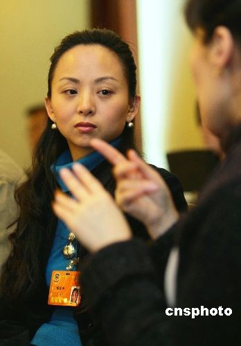 3月5日,全國政協十一屆一次會議進行政府工作報告小組討論。以“千手觀音”舞蹈揚名天下的邰麗華委員在文藝界小組討論中,通過手語翻譯與其他委員交流。邰麗華是中國殘疾人藝術團藝術總監。中新社發 盛佳鵬 攝
