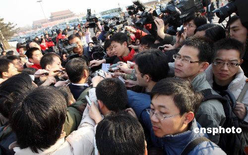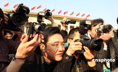 三月五日上午,十一屆全國人大一次會議在北京人民大會堂隆重開幕,新聞大戰就此展開。中新社發 任海霞 攝