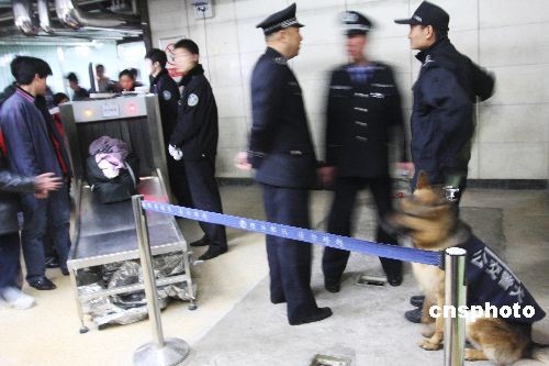 3月7日,北京東直門地鐵車站里,一些民警正帶著他們的公交警犬執(zhí)勤,對旅客的行李進(jìn)行安檢,以確保“兩會”期間旅客的出行安全。中新社發(fā) 追影 攝