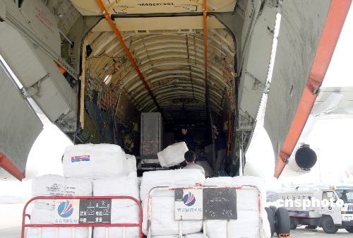 3月9日,俄羅斯聯邦政府向湖南災區捐贈了數千床棉毯和六臺發電機。這是湖南遭遇冰雪災害后第一批由外國政府直接向該省捐贈的救災物資。當日下午1時許,這些救災物資由俄羅斯專機直接從莫斯科運抵長沙黃花機場。圖為機場員工正在卸運物資。中新社發 鄧霞 攝