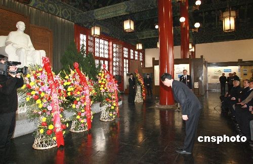 中共中央統(tǒng)戰(zhàn)部副部長樓志豪向?qū)O中山像敬獻(xiàn)花籃。