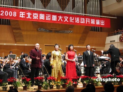 3月20日晚,北京音樂廳上演由中央歌劇院演出的2008年北京奧運重大文化活動開幕音樂會,正式奏響奧運重大文化活動的演出序曲。自此至9月半年時間內,眾多優秀劇目將陸續在北京舞臺展演。中新社發 王彤 攝