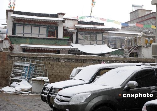 3月21日上午,西藏拉薩降下中雪。圖為羅布林卡路的居民院落。中新社發 廖攀 攝
