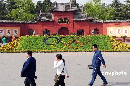 4月初,為了迎接2008奧運會的到來,中國第一千年古剎洛陽白馬寺用花卉制作了大型彩色奧運五環圖案。 中新社發 高山岳 攝