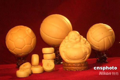 中新網(wǎng)北京四月十五日電 (王歡)中國農(nóng)民用先進(jìn)科技培育出的世界上獨(dú)一無二的足、籃、排三大球造型葫蘆,今天在北京國際會議中心亮相,他們的培育者查泰山將這些“葫蘆”工藝品贈(zèng)送給中國體育博物館,表達(dá)了中國億萬農(nóng)民對北京奧運(yùn)會的祝福和期盼。