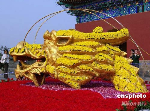 4月18日,金碧輝煌的中國龍造型在鮮花簇?fù)碇谐霈F(xiàn)在天壇公園西下坡花壇,表現(xiàn)出龍騰盛世的宏大場面。 這是天壇公園為迎接4月20日開始的北京國際馬拉松賽精心設(shè)計的。設(shè)計立意采用天壇祭天神樂禮器“麾”的造型,麾是韶樂演奏時用來傳達(dá)音樂起始的號令,其立意在于體現(xiàn)馬拉松測試賽吹響了即將到來的奧運(yùn)號角。中新社發(fā) 九州 攝