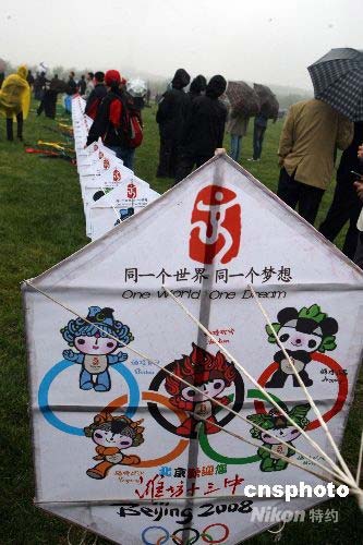 4月21日,第25屆濰坊國際風箏會在山東濰坊浮煙山國際風箏放飛場舉行萬人放飛風箏喜迎奧運活動。當日下著雨,但是參加活動的放飛者和觀眾依然熱情不減,盡顯世界風箏之都——濰坊的魅力。圖為濰坊十三中學生手繪的由300多幅,208米長的迎奧運巨型風箏格外引人注目。作者: 趙雋