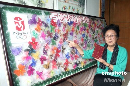 2008年4月23日,遼寧省二建筑工程公司退休職工76歲的老人白宏俊,忙碌5個月編制的長2米、寬80厘米的《百蝶迎奧運》掛圖,在版權局辦完了作品登記,拿到了“專利”證書。中新社發 劉寶成 攝