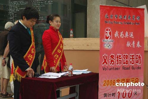 4月29日,在北京奧運會倒計時100天即將到來之際,北京市規劃展覽館在前門東大街開展“我為奧運獻青春 義務指路活動”,為國內外游客提供義務指路服務。中新社發 九州 攝