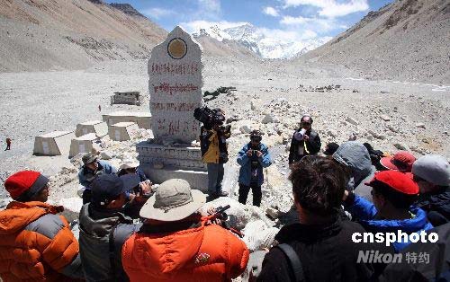 4月30日,北京奧運會倒計時100天,受邀采訪2008北京奧運會火炬接力珠峰展示活動的中外媒體記者,集體在珠峰大本營探營。圖為他們在珠峰大本營珠穆朗瑪峰高程測量紀念碑前集體進行采訪。中新社發 盛佳鵬 攝