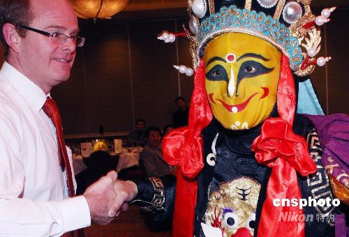 5月6日晚,在北京舉行的中外商貿(mào)合作項(xiàng)目洽談酒會(huì)上,來(lái)自四川的著名變臉?biāo)嚾藶榧钨e現(xiàn)場(chǎng)進(jìn)行精彩的“變臉”,表演受到在座外國(guó)賓客的熱烈歡迎。中新社發(fā) 錢興強(qiáng) 攝