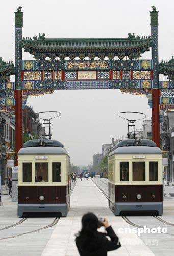 2008年5月7日,工作人員在對當當車進行調試。北京前門大街整修主體結構已基本完成,但前門大街的外圍仍被景觀布阻擋,游客只能隔著遮擋觀看、拍攝大街。中新社發 魯谷 攝