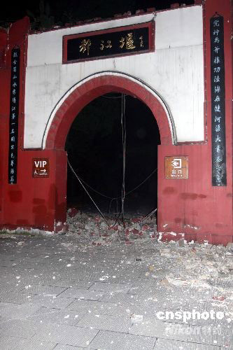 5月12日14時28分,在四川汶川縣(北緯31度,東經103.4度)發生7.8級地震。都江堰市區受地震災害影響嚴重,多處房屋倒塌。圖為都江堰景區受損的大門。 中新社發 黃榮 攝