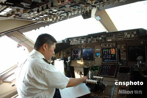 五月十三日,深航旗下中德合資翡翠航空大型貨機747-400/JI7451受命運輸?shù)卣鹁葹奈镔Y,從天津?qū)揖葹膸づ竦榷偎氖藝嵨镔Y專機緊急運往地震災區(qū)。圖為深航副總裁劉清貴做飛行前準備。中新社發(fā) 陳文 攝