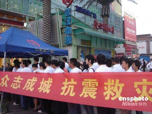 5月13日,驚聞四川地震災區血液告急,同飲一江水的湖北武漢民眾主動走向設在三鎮街頭的采血點,挽起手臂捐獻血液,以備災區不時之需。當天,武漢市共有七百零八人參與獻血,共計采集九百四十三個單位、十八點八六萬毫升血液,兩項數據分別較平日增加了四成比例。中新社發 徐金波 攝